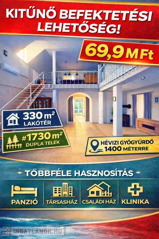 Kétszintes, több külön bejárattal rendelkező, 9 szobás, teraszos családi ház, a Hévízi tótól mindössze 1400 méterre eladó. A házban jogilag és fizikailag is lehet két lakásos társasházat kialakítani:150 és 140 nm-es alapterülettel.