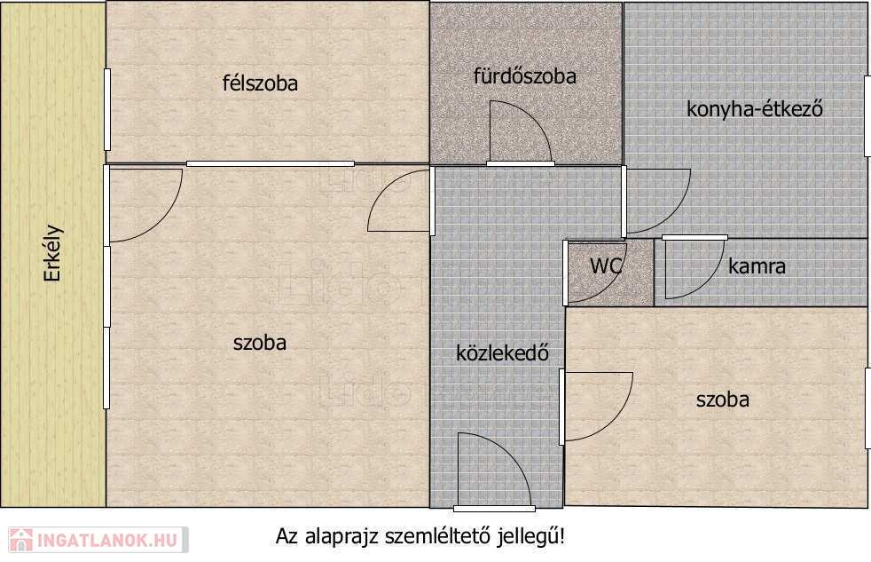 A 64 m2-es lakás helyiségei: nappali, szoba, félszoba, konyha, kamra, fürdőszoba, WC, közlekedő, erkély.
